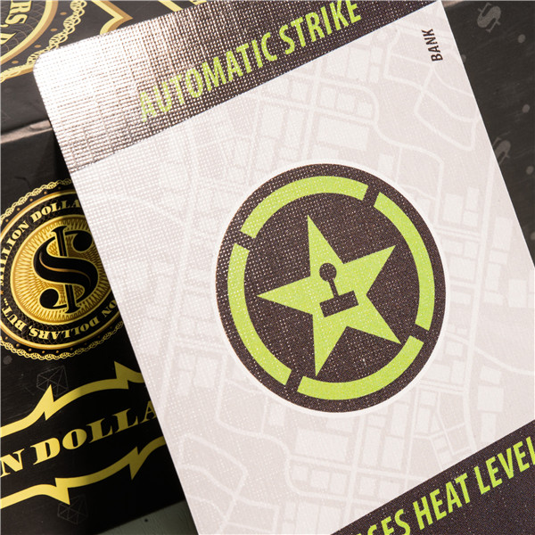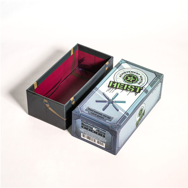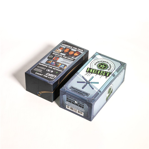 Customization | Custom size, heist-themed artwork, game rule printing, inner tray layout, and card design |